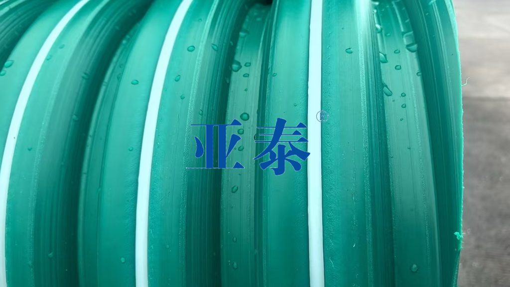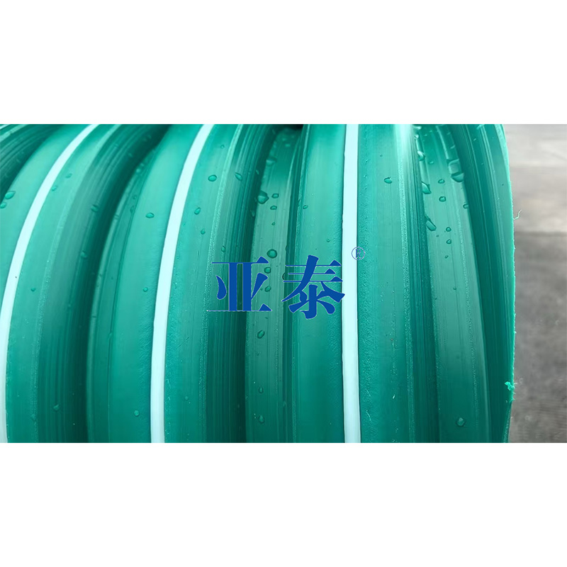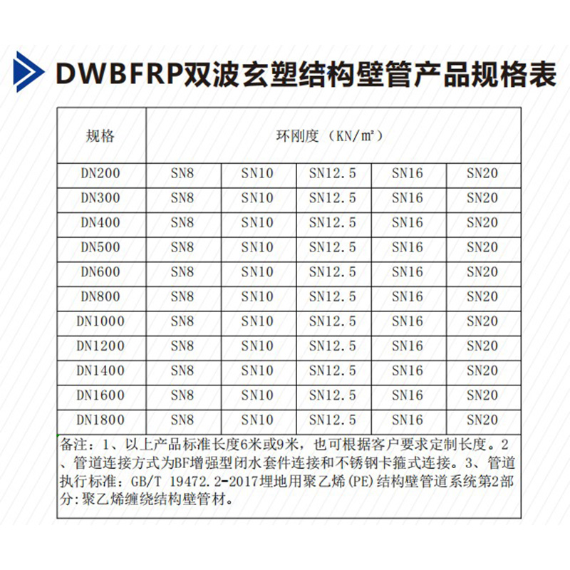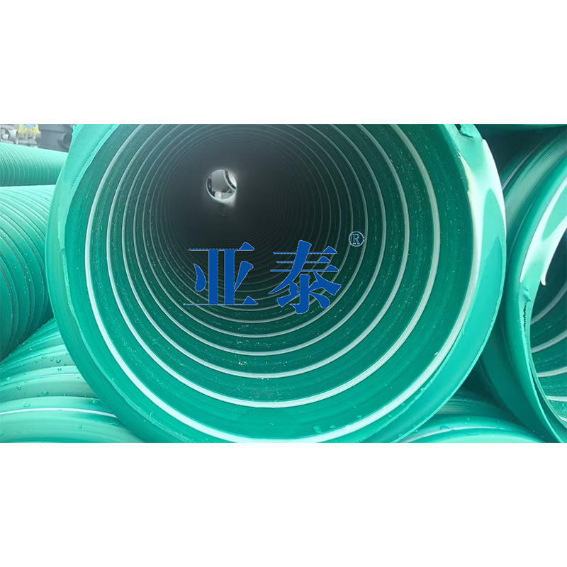 Трубы DWBFRP с двойной волнистой композитной структурой нашей компании изготовляются методом спиралевидного навивания из листов, произведенных по уникальной технологии двойного коэкструзии при термическом плавлении из свежих гранул полиэтилена высокой плотности (ПЭВД). Внутренний слой трубы представляет собой двойной армированный лент (зеленый снаружи, белый внутри) с гладкой поверхностью; в внутренней стенке добавлены базальтовые волокна, которые усиливают износостойкость и коррозионную устойчивость трубы, тем самым продлевая ее срок службы. Усилительные ребра из оцинкованного стального лента на внешней поверхности трубы имеют спиралевидную волнистую структуру, что увеличивает сопротивление трубы внешнему давлению. Продукт предназначен для использования в коммунальных подземных системах дренажа и канализации, внешнего водоотвода зданий, а также для транспортировки и направления воды в сельском и промышленном хозяйстве, а также для выпуска наводнительных вод и т.д.